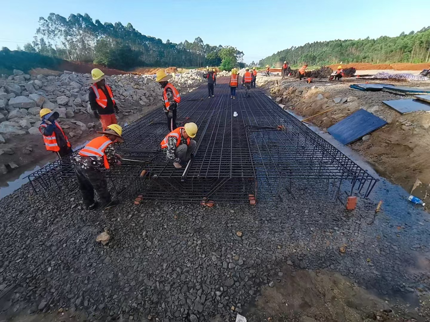(圖片為工人綁扎涵洞鋼筋施工)