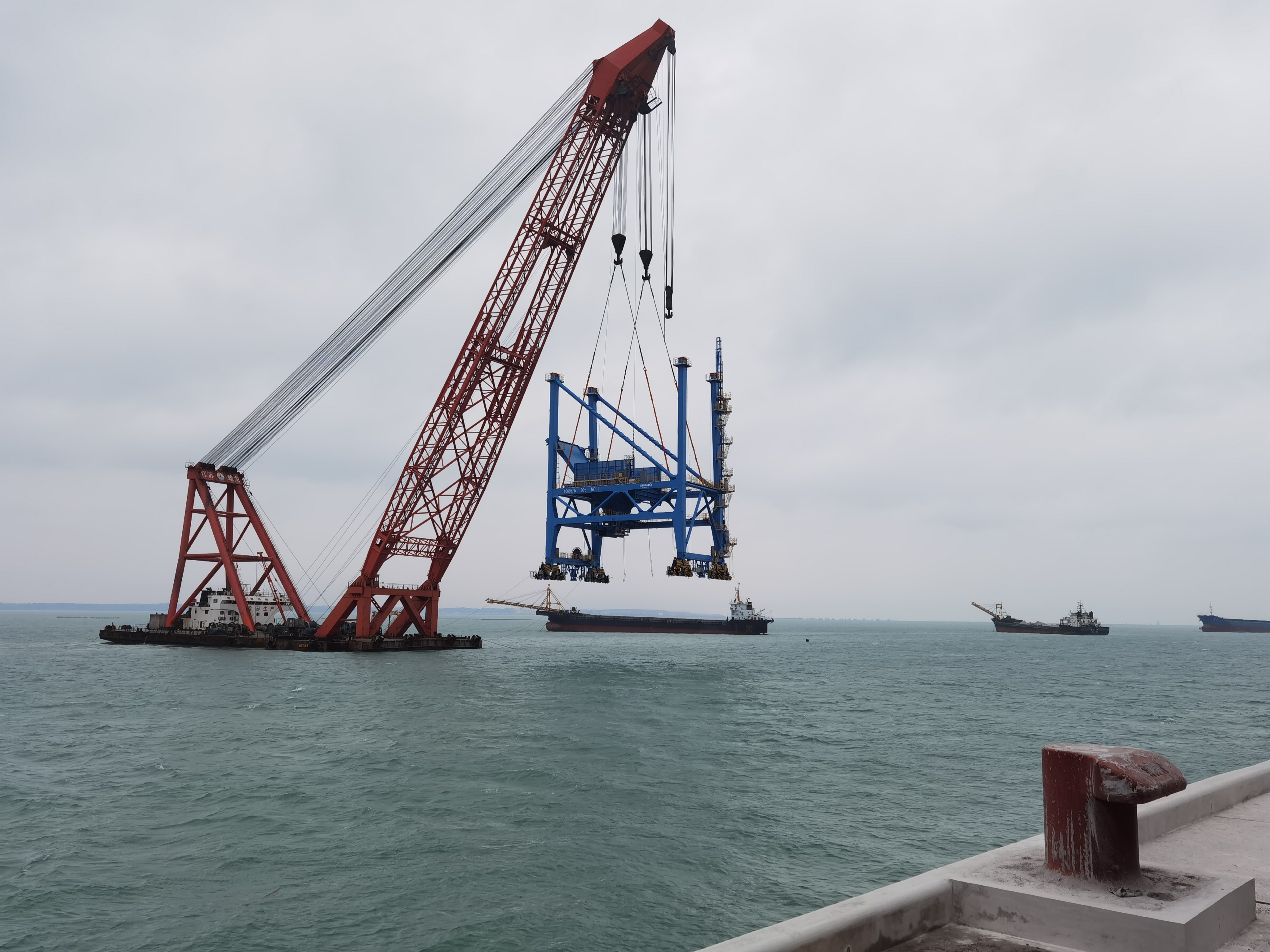 8號(hào)9號(hào)泊位工程本次配套設(shè)備共有5臺(tái)(4臺(tái)橋式抓斗卸船機(jī)、1臺(tái)帶斗門座起重機(jī)),抓斗卸船單機(jī)重量約1000噸,作業(yè)效率為煤炭1000噸/小時(shí);木片2000m³/小時(shí);帶斗門座起重機(jī)單機(jī)重量約754.9噸,起重量為吊鉤:50t/25m;45t/37m;抓斗40t/37m。配套設(shè)施分兩批次進(jìn)場,第一批4臺(tái)橋式抓斗卸船機(jī)設(shè)備于2月28日起陸續(xù)抵達(dá)碼頭,第二批1臺(tái)帶斗門座起重機(jī)預(yù)計(jì)4月30日抵達(dá)碼頭。